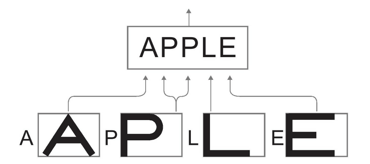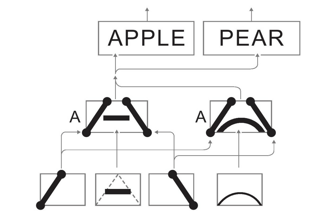 组成“A”的两种不同模式,以及更高层级上的两种不同模式(“APPLE”和“PEAR”),“A”是其中一部分。