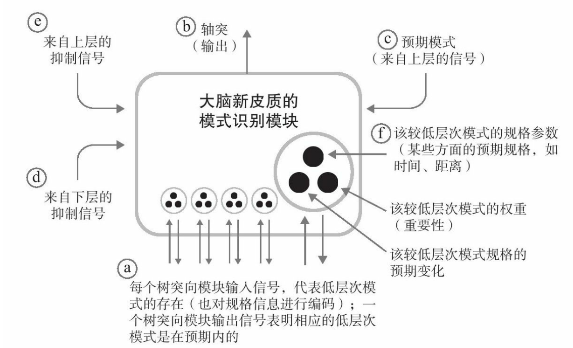 需要注意的是,每一个层级包含一个模式。这样,图形是模式,字母是模式,词语也是模式。每个这类模式都有一组输入信息、识别模式的处理程序(以模块内发生的输入为基础),以及有一次输出(输向相邻的更高层级的模式识别器)。