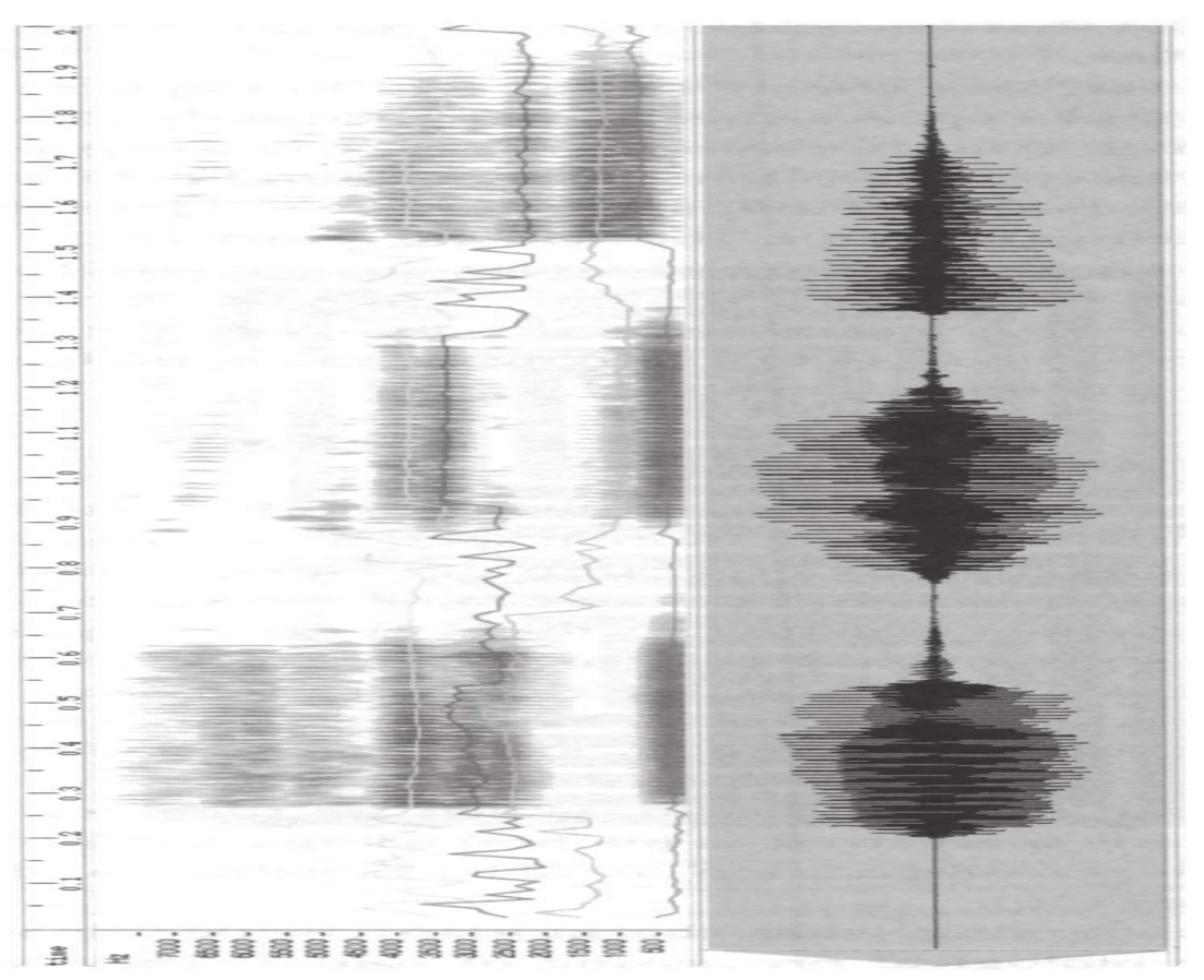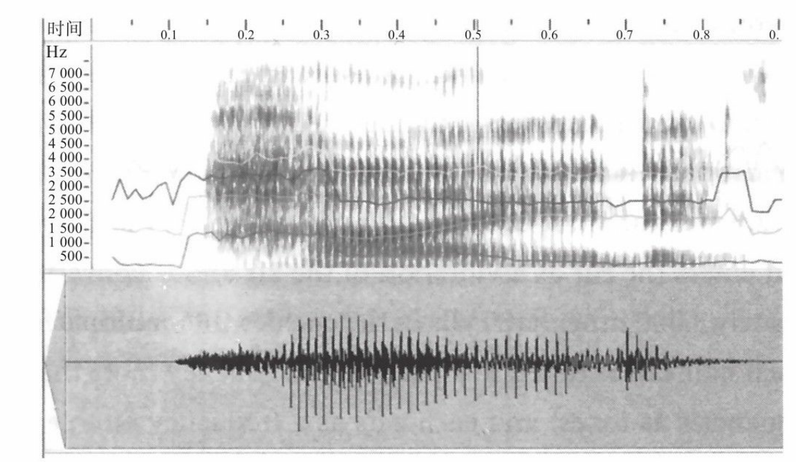 注:水平部分显示了说话者声音的共振峰。共振峰不仅频繁出现,而且峰值较高。