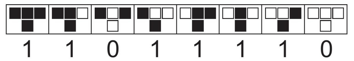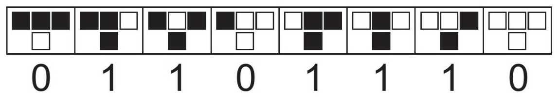 再次计算这8种可能的单元格值的组合,该单元格的左右邻居的值显示在第一行。重新计算出的值显示在最后一行。因此,如果单元格是黑色的,而它的两个邻居也是黑色的,则该单元格的下一代也是黑色的(参见图9-1最左边的子规则)。如果单元格是白色的,它的左邻是白色的,它的右邻是黑色的,那么它的下一代将变为黑色(参见图9-1右起的第二个子规则)。