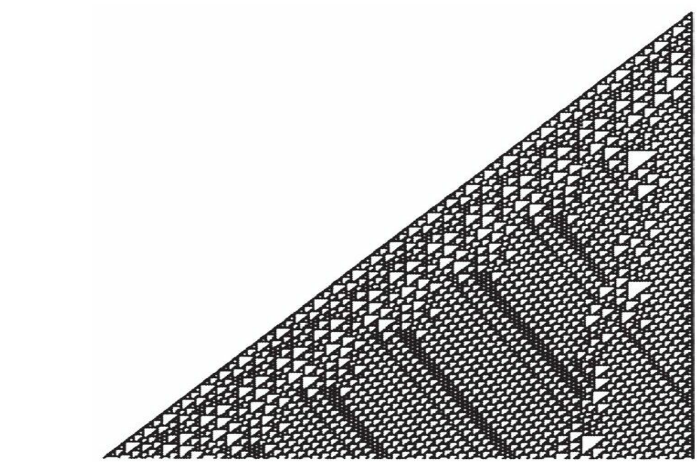 对于第110号自动机和IV级自动机来说,一般而言,两者的结果是完全不可预测的。这些结果通过了严格的数学随机测试,却完全不会产生噪声:也会有重复的模式,但它们重复的方式是随机的,不可预知的。要是我问你某个特定的单元格在经过一兆兆次迭代之后的值是多少,如果这个机器没有经历过那么多代的更迭,你就没有办法回答这个问题。解决的办法是明确的,因为这是一个非常简单的确定性机器,但要是在没有实际运行这个机器的情况下,结果是完全不可预测的。
