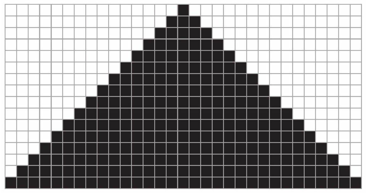 这个简单的元胞自动机适用于整行的单元格。如果我们从中间的一个黑色单元格开始,并显示单元格进化多代后的值(我们每向下移动一行就代表一个新一代的值),那么第222号机的结果如图9-2所示。