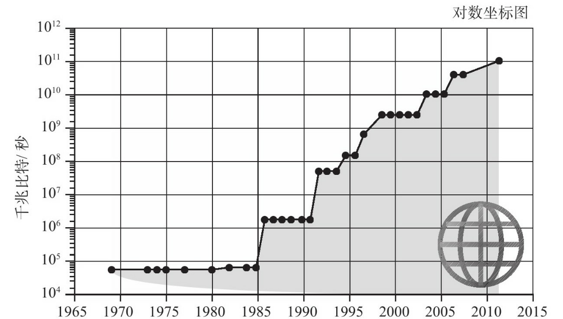 另一项信息技术也经历了平稳的指数级发展,那就是我们与他人沟通和传递人类知识库中海量信息的能力。有很多方法解释这个现象,其中,库伯定律(Cooper’s Law)认为,指定无线电频谱中无线通信的总比特容量每30个月就会翻一番。从1897年马可尼用无线电报传递摩尔斯电码,到今天4G通信技术的应用,这个定律都被认为是正确的。根据库伯定律,一个多世纪以来,在指定无线电频谱中传递的信息量每两年半就翻一番。再如,互联网上每秒比特的传递量每16个月就翻一番(见图10-3和图10-4)。