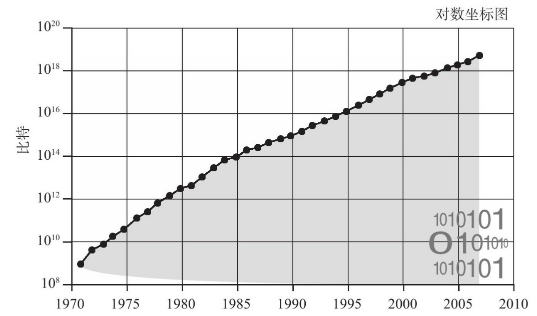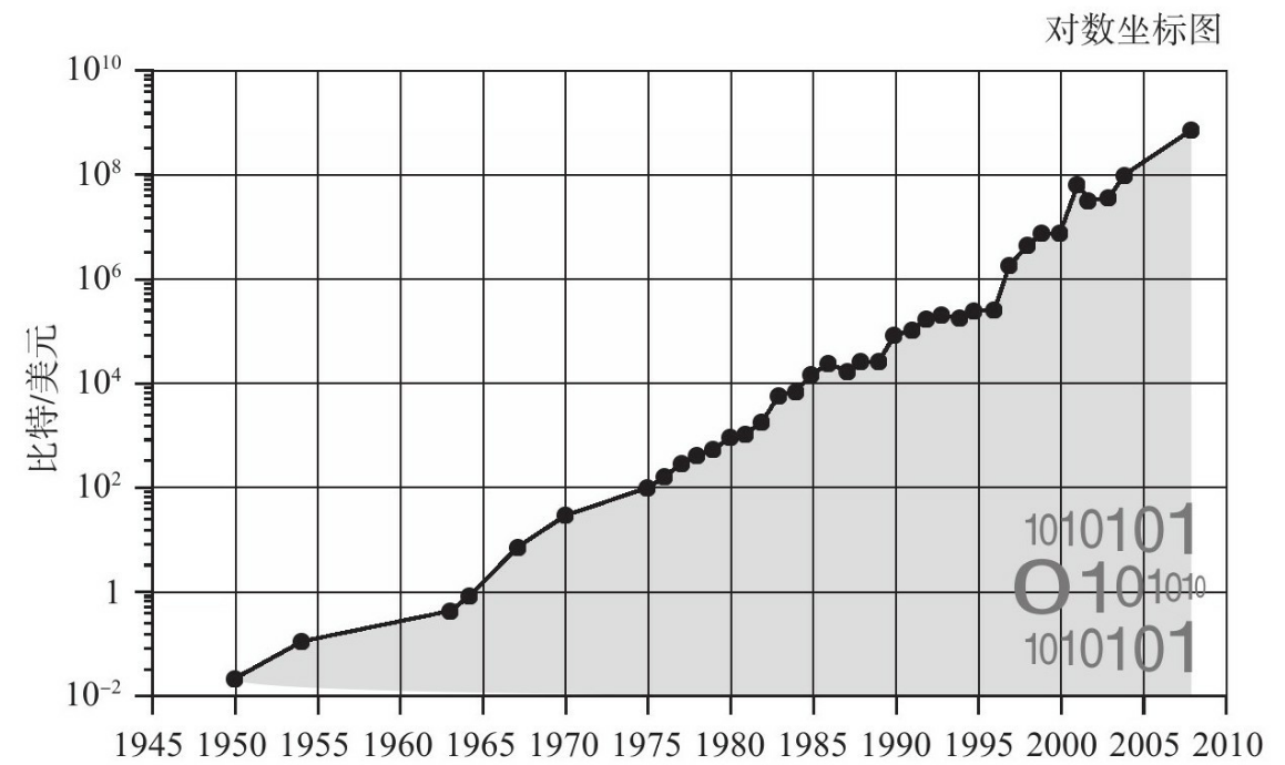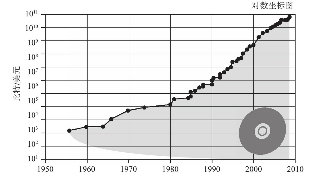 图10-12磁性数据存储中每1美元(连续2000美元)比特数增长变化[202]
