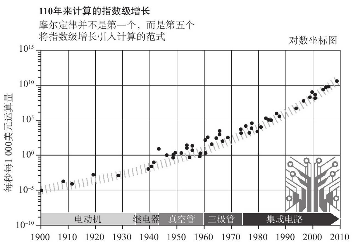 要注意的一点是,并不是所有的指数现象都属于加速回报定律。很多观察家误解了加速回报定律,他们引用那些并不属于信息范畴的指数趋势:例如,他们解释说,男人的剃须刀从单面变成双面,再变成四面,他们的疑问是,为什么没有八面的剃须刀?可是,剃须刀并不是(至少还没成为)一门信息技术。