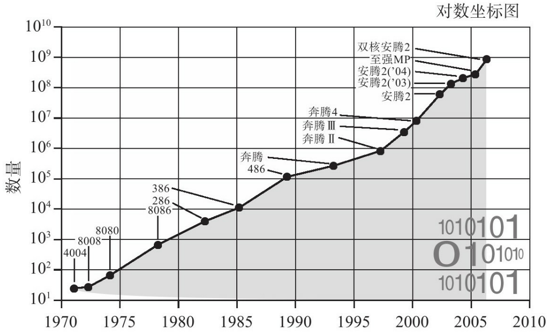 图10-7英特尔不同处理器中每个芯片中三极管的数量差别[197]