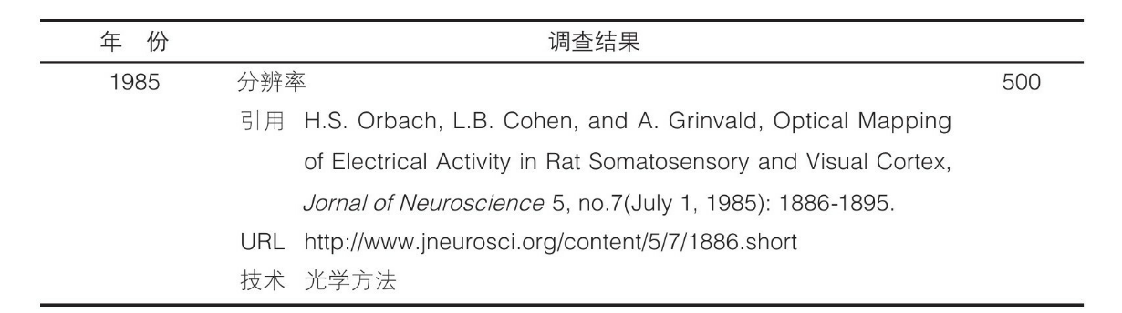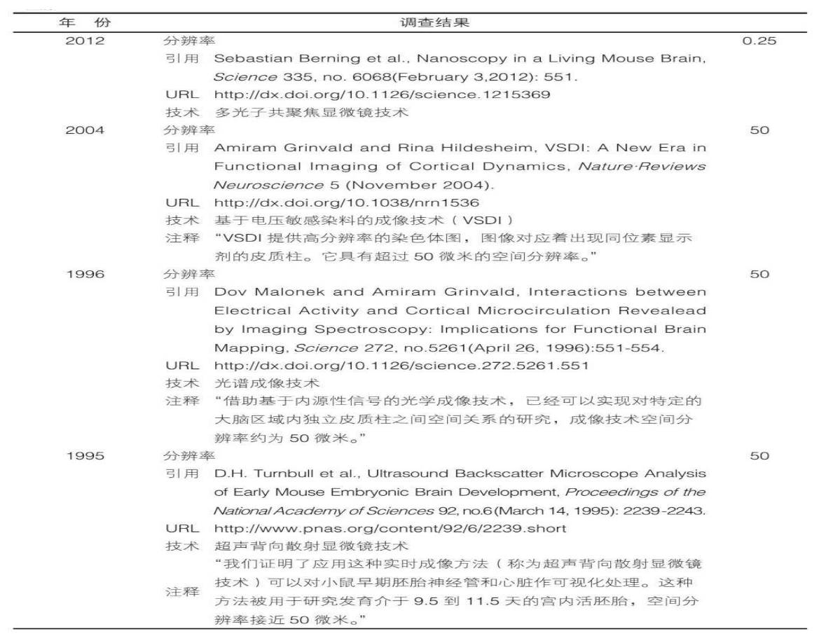 [208]19.以微米(μm)为单位的动物大脑无损成像技术的空间分辨率,1985—2012年: