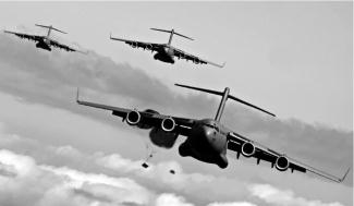 C-17“环球空中霸王Ⅲ”是麦道公司(现并入波音公司)为美国空军研制的一种采用上单翼、四发、T形尾、带后卸货板的新型运输机。机身长53 米,机高16.8米,翼展503米,外形尺寸与C-141相当。最大起飞重量263 吨,最大载荷为150吨。机上带75.8吨载荷时,C-17可从2320米长的跑道起飞,然后在915米长的简易跑道上着陆。该机性能先进,装备部队后在多次局部战争中表现出了极佳的作战能力。由于美军不再订购新的C-17,而外国客户的订购数量不足,C-17的生产线面临关闭的危险。波音公司正努力谋求更多国内外订单,以维持生产线的生存。