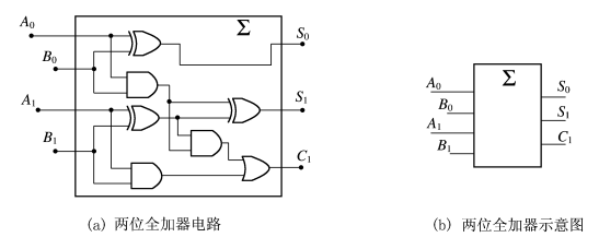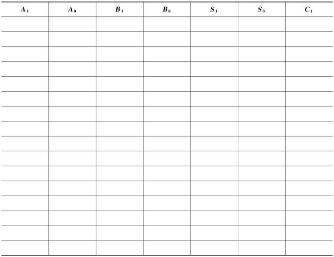 图4.1.6所示是一个两位全加器电路,输入:A=A1A0;输入B=B1B0,输出S=S1S0;输出进位C=C1。试设计一个该器件的逻辑功能的测试电路,并对该电路进行运行测试,将测试结果填入真值表4.1.5中。