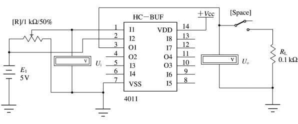 图4.1.3为CMOS与门电路的传输特性测试电路。比照TTL门电路的测试方法进行电路仿真和测试。将观察结果填入表4.1.2并画出坐标曲线。