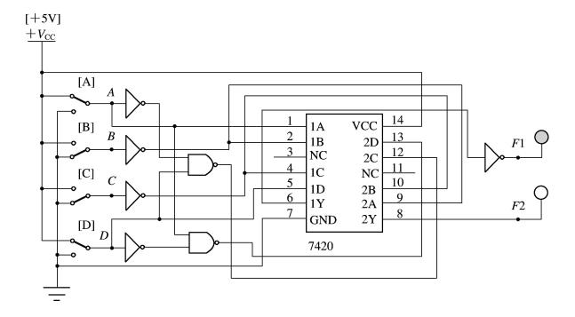 图4.2.3是使用与非门和非门实现的数字锁参考电路。