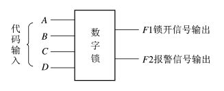 该锁原理框图如图4.2.2所示,其中ABCD是四个代码输入。每把锁都有规定的四位数字代码(如1001、1101等等,可由读者自编)。如果输入代码符合该锁代码时,锁才能被打开(F1=1);如果不符,开锁时,电路发出报警信号(F2 =1)。不开锁时,即没有输入(ABCD均为0)时,无信号输出(F1= 0,F2 = 0)。