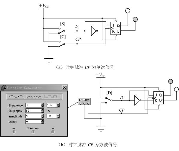在“Digital”库中选择一个D触发器,比照JK触发器的测试方法,完成对D触发器的功能检测。