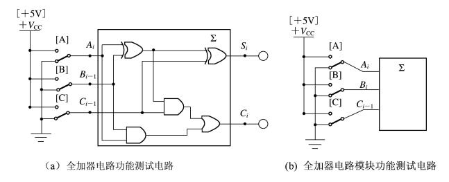 全加器逻辑功能的测试电路如图4.1.5所示。对该电路进行测试,并将测试结果记录在真值表4.1.4中。