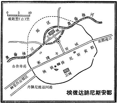 我们由《魏略》一书,可以断定魏代(公元3世纪)中国作者已知埃及沿岸各海港的贸易情形。这个时代的大秦必然包括埃及。《魏略》云:“其国在海西,故俗谓之海西,有河出其国西,又有大海。”我前面已经指出,海西即指红海;此处所言之河,我相信即尼罗河;“又有大海”,就是地中海。《魏略》又云:“海西有迟散城。”迟散二字的古音,可以推断为Disan。[52]我敢说这是中国人对尼罗河支流上的亚历山大城(Alexandrea)的读法。《魏略》更云:“从国下直北至乌丹城。”“从国下”一语,可能中国的作者依照一位进入红海的旅行家的观点,指尚未到其国。他一定是向北直驶,才到达苗司霍尔姆司(Myos Hormo s),本地之人或称为乌丹。[53]在此地的西南,有商路于科土斯(Koptos)附近与尼罗河相接,据中国史家说,“西南又渡一河,乘船一日乃过”,也许是指科普托斯的面积而言的一种夸张之说。称“有河出其国,西又有大海,海西有迟散城,从国下直北至乌丹城,西南又渡一河,乘船一日乃过,西南又渡一河,一日乃过,凡有大都三,从安谷城陆道直北行之海北,复直西行之海西,复直南行经之”的一大段文字,似述取道埃及(苗司霍尔姆司、科普托斯、亚历山大城)而至叙利亚之路(安都、泰尔或另一腓尼基城)。其谓“凡有大都三”,或指埃及(即指迟散城之国)之分为三大部[三角洲(Delta),黑普提隆米斯(Heptanomis),西培伊斯(Thebais)]。《魏略》更谓“乌迟散城渡一河乘船一日乃过,周回绕海,凡当渡大海六日乃到其国。”据我现在对这段文字的理解,它是记述由亚历山大城至大秦京都安都的路程。乌迟散三字WuChihSan的古音可读为Odisan,乌Wu或O是附加部分,可略去而读为ChihSan,我认为这就是Alexandria(亚历山大)城的音转。由此城至濒海的安都(据说奥伦梯河Orontes在古代可以通航远至安都Antioch),全程约四百浬。以每日行七十浬之速率,需时约六日。[54]一日渡河,然后六日航海,也许是由于选取了通往加诺帕斯(Canobus)城或郊外的Ostium Herocleoticum河口,此地有一通航的运河与小内港基培塔斯(Kibotus)相连,距出发点约十五浬。因此由启碇而至出海需要一天的工夫。[55]我倾向于相信经由尼罗河而以安都或其他叙利亚港口为目的地的中国或印度商货,并不驶入亚历山大城的任何海港,而是经过监视河内外贸易之海关(根据斯特累培之语),以前已经用船驳运,因此旅行者可以入城或在城的东郊行乐,无须在城的地中海方面上船继续起程。[56]