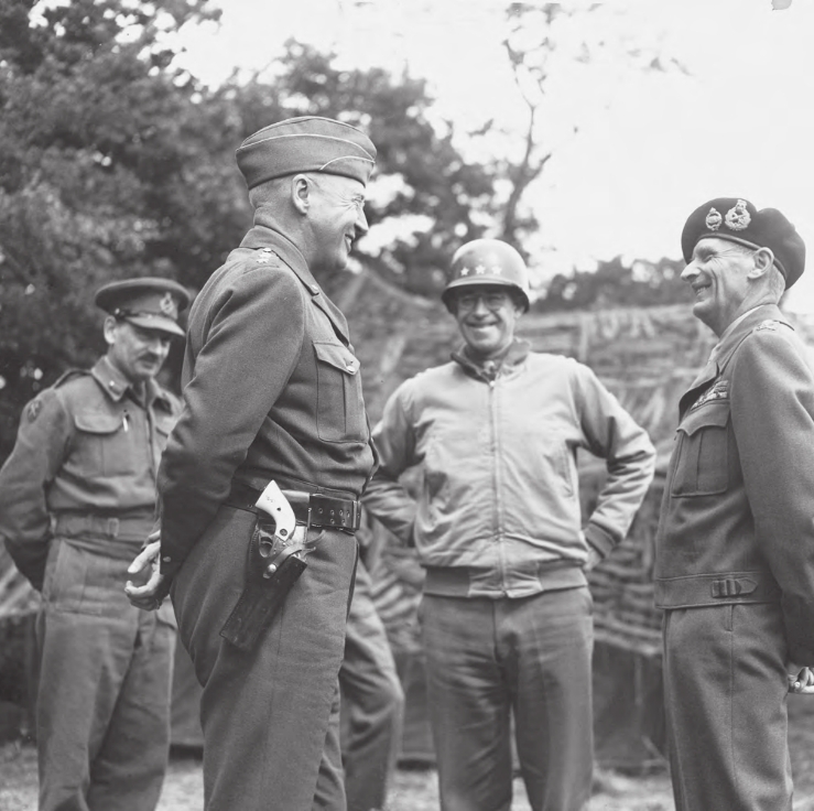 巴顿将军(左起第二)与传奇的英军指挥官蒙哥马利将军(最右)交谈融洽。陪伴他们的还有邓普赛(Dempsey)将军(最左)和布莱德雷将军(右起第二)。