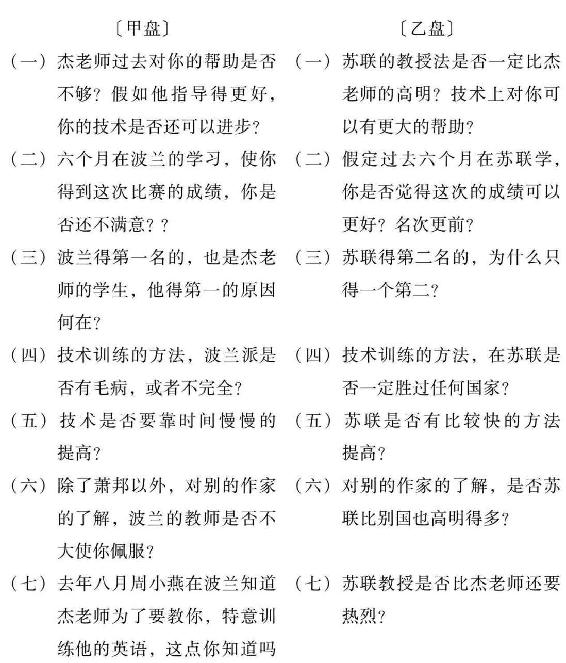 (三)技术训练的方法,波兰远不如苏联。杰老师除了头上几课略微讲了一些(主要仍是我自己摸索出来的),后来从未上过技巧的课。什托姆卡的方法在波兰是比较好的。斯坦番斯卡和斯曼齐安卡,原来都是他的学生,技巧的根基是由他打定的。