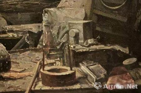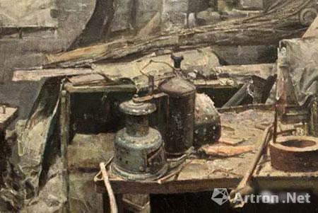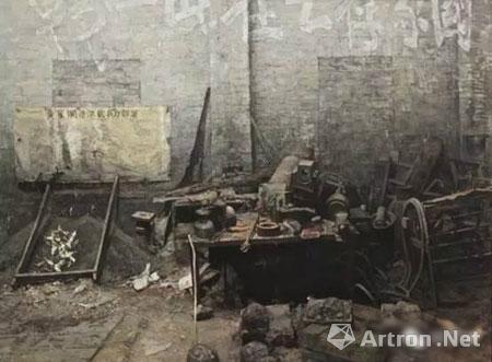 今年9月3日是中国人民抗日战争暨世界反法西斯战争胜利70周年纪念日,这种特定的语境塑造了自身独特的诗学话语。我的油画《黄崖洞兵工厂》,是2015年7月为了纪念抗战胜利70周年创作的。为此,我专门去了黄崖洞实地考察,当年仅有的一点遗迹、遗物、和资料是我依据的全部。在这些遗物中,我印象最深刻的要数1940年8月由刘贵福设计、各分厂生产的马步枪了。在构思当中,我把马步枪放在了一个比较重要的位置,之所以在后来形成的构图中选择了一角,就想通过当年的一些物件与背景,诠释一种艰苦条件下打败日寇的信心与决心,来启迪后人。开始画时,总不时被画面灰色调带入当时的环境中,刻画得每一细节,都能感觉到是在诉说一段故事。“诉说一段故事”,是一个发现的过程,是一个当代的主题精神进入历史的过程。黄崖洞兵工厂不仅为中国的革命和解放制造了大量的武器和炸药,而且锻炼出一大批优秀的军工人才。黄崖洞是英雄山,是民族精神的脊梁,是抗日救国的盾牌。黄崖洞工厂的创业和奋斗精神如太行之伟岸,似漳河之长远。