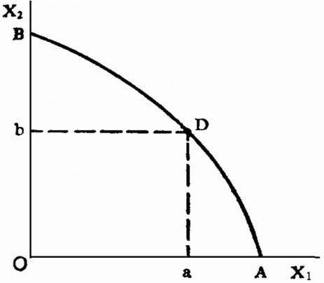 假定有一确定数量的产品要在两个人(X1与X2)中间分配(见图3)。设曲线AB代表X1的相应水平的所得,并且没有其他的产品分配办法可令X2的状况比这曲线所指示的对应各点更好。试考虑D点=(a,b),那么让X1处在a水平,X2能达到的最好水平就是b水平了。在图3中,O点(原点)代表任何产品被分配前的状况,在曲线AB上的各点是有效率的各点,每一点都满足了巴莱多的标准:没有任何再分配方式能使一人状况更好而不使另一人状况变坏。这就是曲线AB向右下方倾斜的事实所表达的。由于只有一确定量的储存,就决定了一人有所得时另一人必有所失(当然,这一假定是偶然落入社会基本结构情况中的,这一基本结构是产生一种积极利益总额的合作体系)。OAB区通常被看作是一个凸面,这意味着对于这一凸面中给定的任何两点来说,连接这两点的直线上的各点也是处在凸面内。圆形、椭圆形、正方形、三角形等等,都是凸面。