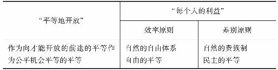 我已经提到过:由于“每个人的利益”和“平等地向所有人开放”是含糊不清的,第二个原则的两部分就各有两种自然的意义。又因为这些意义都是相互独立的,这一原则就有了四种可能的意义。假定有关平等自由的第一个原则有完全一致的意义,那么我们对这两个原则就有四种解释。这些解释见下表: