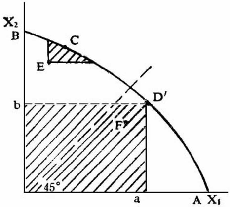 如此看来,我们并不能说AB线上任一点都优于OAB区域内的所有点。线段AB上的每一点都仅仅优于那些在它左下区域内的各点。这样D点就优于连接D、a、b点的虚线划出的长方形区域内的所有点。但D点并不优于E点。这两点不可能比较出等级。然而C点却优于E点,而且,曲线AB上那些属于以E点作为三角形的一个顶点用斜线划出的小三角形区域的各点也都优于E点。