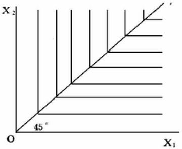 为简化起见,我们假定三个代表人。设X1是最有利者,X3是最不利者,X2则为居间者。设X1的期望是沿着水平轴画出的,X2与X3的期望是沿着垂直轴画出的。这些表示最有利者对别的群体的贡献的曲线在代表平等的假设状态的原点开始。而且,允许给最有利者的最大利益是受下述前提限定的,即纵使差别原则允许这一利益,如果它对政治体制有一不正义的效果,也要被自由优先的原则排除。