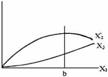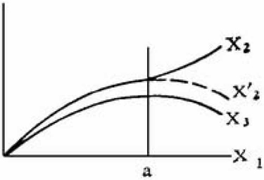 链式联系意味着:在X3曲线向右升高的任何一点,X2曲线也在升高,正如图9中a点和图10中b点左边的区间所示。链式联系与X3曲线正向右降低的情况无关,如图9中a点右面的部分。X2曲线此时可能或是升高(见图9中实线X2)或是降落(见虚线X′2)。链式联系不适于图10中b点右面的情况。