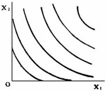 有一种比差别原则平均主义程度较低、初看起来也许要更合理的观点,它认为:对于正义的分配(或对于所有被考虑的事情)的无差别曲线是图7中凸面朝着原点的平滑曲线。有关社会福利函数的无差别曲线常常是以这种形式表现的。这种曲线表示以下事实:当其中一人与另一人相比增加了所得时,他的进一步所得从某种社会观点来看价值就降低了。