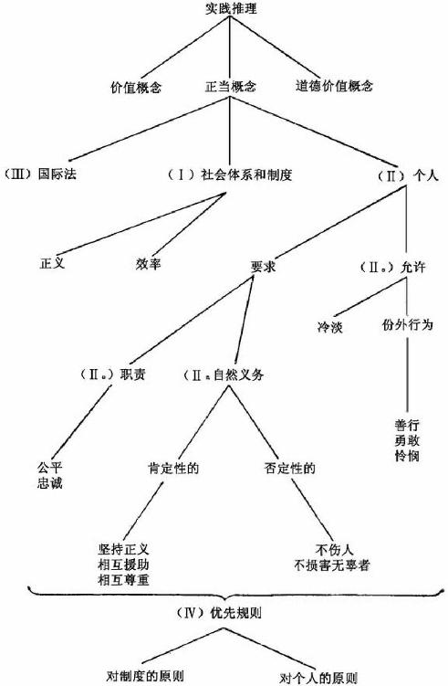 这里的图表纯粹是纲要式的。它并不暗示着:与较下面的概念相联系的原则是从与较上面的概念相联系的原则中推演出来的。这一图表只是指出:在一个完全的正当观形成之前,必须选择哪些种类的原则。罗马数字表示了在原初状态中接受各种不同的原则的次序。这样,对于社会基本结构的原则就要首先达成协议,然后是对于个人的原则,再后是那些用于国际法的原则,最末是优先的规则,虽然我们可能先试验性地选择一些作为应急之用,然后再来修正它们。