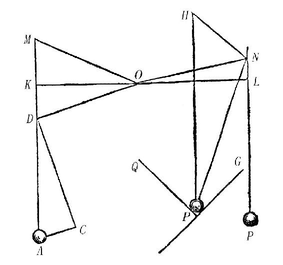 但是如果权p,它等于P,部分地被细线Np支撑,且部分地倚在倾斜的平面pG上:引pH,NH,前者垂直于地平线,后者垂直于平面pG;且如果p的向下的重力由线pH表示,这个力能分解为力pN,HN。如果某个平面pQ垂直于细线pN且截另一平面pG于平行于地平线的一条直线;且权p只倚在这些平面pQ,pG上;它以力pH,HN垂直地压迫这些平面,即以力pN压迫平面pQ,且以力HN压迫平面pG。且因此如果平面pQ被除去,使得权拉紧细线;因为支撑权的细线现在取代了被除去了的平面的地位,线被同样的力pN拉紧,平面先前被它压迫。因此这条倾斜的细线的张力比另一条垂线PN的张力,如同pN比pH。且所以,如果权p比权A按照一个比,它由来自从轮子的中心到它们各自的线pN和AM的最短的距离的反比,和pH比pN的正比复合而成;则两个权有使轮子运动的相同的效力,且因此相互遏制,正如任何人可以试验的。