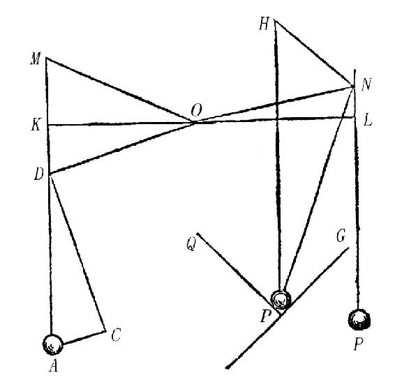 如同从任意一个轮子的中心O伸出的不等的半径OM,ON,由细线MA,NP支持着权A和P,且需求使轮子运动的重力。过中心O引垂直于细线的直线KOL交细线于K和L,且以中心O和间隔OK,OL中的较大者OL画一圆交细线MA于D:又作直线OD,AC平行于它,再者DC垂直于它。因为细线上的点K,L,D是否属于轮子的平面并无差别;无论悬挂在点K和L或者D和L,权的作用相同。设权A的整个力由细线AD表示,且这个力被分解为力AC和CD,其中的AC直接地自中心拉半径OD,对使轮子运动没有一点作用;但是另一个力DC,垂直地拉半径DO,犹如它垂直地拉等于OD的半径OL,效果是相同的;这就是,它与权P有相同的作用,只要那个权比权A如同力DC比力DA,亦即(由于三角形ADC,DOK是相似的)如同OK比OD或者OL。所以权A和P,与处于平直位置的半径OK和OL成反比时,它们的功效相同,且因此停留在平衡的状态:这是天平、杠杆和绞盘的悉知的性质。但是如果任一权较按照这个比大,它的使轮子运动的力也如此大。