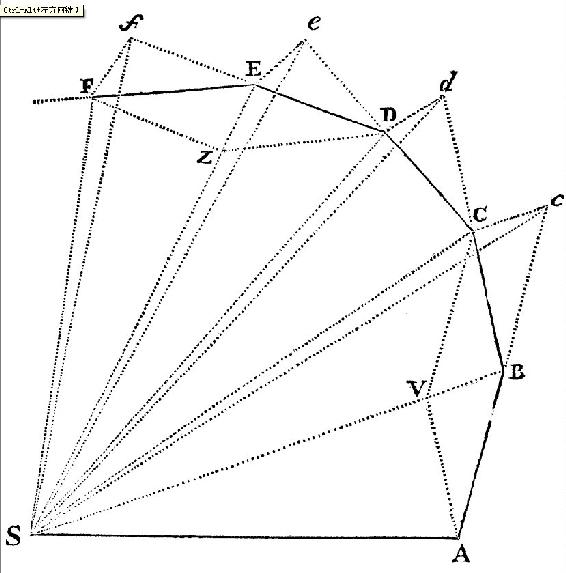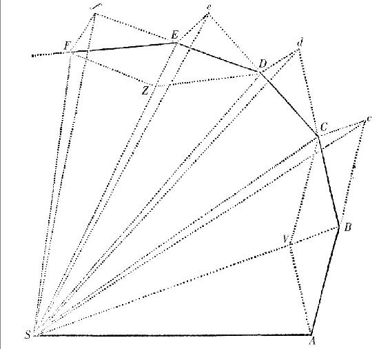 时间被分为相等的段,且在第一个时间段物体由于其固有的力画出直线AB。在第二个时间段,同一物体如果没有阻碍,它将一直前进到c,(由定律I)画出等于AB的线Bc;因此往中心引半径AS,BS,cS,画出的面积ASB,BSc相等。然而当物体到达B时,假设向心力以一次但有力的冲击,致使物体由直线Bc倾斜并在直线BC上前进。引cC与BS平行,交BC于C;则第二个时间段完成时,物体(由诸定律的系理I)在C被发现;它在与三角形ASB相同的平面。连结SC,因SB,Cc平行,三角形SBC等于三角形SBc,因此也等于三角形SAB。由类似的论证,如果向心力相继作用在C,D,E,等等,使物体在各自的时间片段各自画出直线CD,DE,EF,等等,它们全都位于同一个平面;且三角形SCD等于三角形SBC,[三角形]SDE等于[三角形]SCD,[三角形]SEF等于[三角形]SDE。所以在相等的时间,相等的面积在不动的平面上被画出:且通过复合,任意的面积和SADS,SAFS彼此之间,如同画出它们的时间。现在三角形的数目无限增加且其宽度减小以至无穷,且最终它们的周线ADF(由引理三的系理四)为曲线:因此向心力,由它物体持续从这条曲线的切线上被拉回,此作用从不间断;且画出任意的面积SADS,SAFS总与所画的时间成比例,面积在此情形与那些时间成比例。此即所证