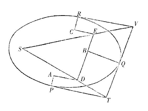 因为由中心S落到切线PT,QT上的垂线(由命题I系理1)与物体在点P和Q的速度成反比;因此由作图与垂线AP,BQ成正比,亦即如同由D点落到切线[PT]上的垂线。因此易于推断出点S,D,T在一条直线上。又由类似的论证,点S,E,V亦在一条直线上;且所以中心S位于直线TD,VE的相交之处。此即所证