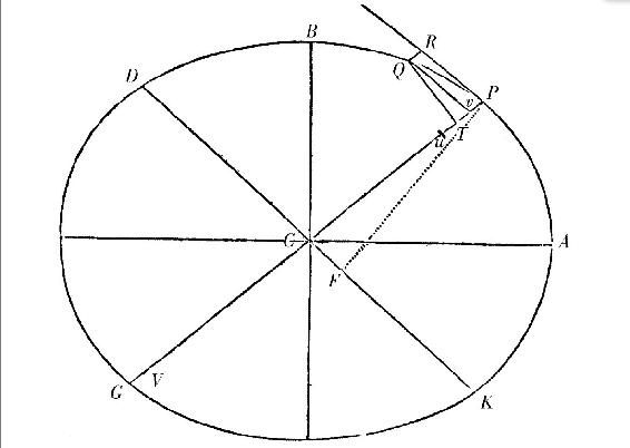 在直线PG上点T的另一侧按照Tu等于Tv取点u;然后取uV,它比vG如同DCquad.比PCquad.。又因为由《圆锥截线》,Qvquad.比PvG如同DCquad.比PCquad.,Qvquad.等于Pv×uV。两边加上矩形uPv,出现弧PQ的弦的平方等于矩形VPv;且因此圆,它与圆锥截线在P点相切,穿过点Q,亦穿过点V。点P与Q重合时,uV比vG之比,它与DCq比PCq之比相同,变成PV比PG或PV比2PC之比;因此PV等于(2DCq)/(PC)。是以力,由它物体P在椭圆上运行,与(2DCq)/(PC)乘以PFq成反比(由命题VI系理3),这就是(由于2DCq乘以PFq给定)与PC成正比。此即所求