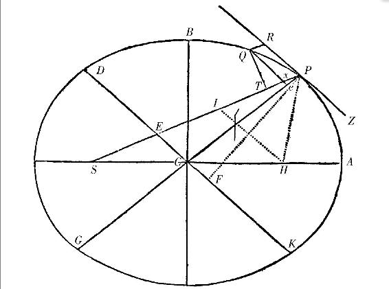 令S为椭圆的一个焦点。引SP截椭圆的直径DK于E,又截纵标线Qv于x,再补足平行四边形QxPR。显然EP等于半长轴AC,如此是因为,由椭圆的另一焦点H作平行于EC自身的线HI,因CS,CH相等,ES,EI也相等,至此EP是PS,PI,亦即(因HI与PR平行,且角IPR与HPZ相等)PS,PH的和之半,它们连结起来等于整个轴2AC。向SP上落下垂线QT,称L为椭圆的主通径(13)(latus rectum principale)(或 ,则L×QR比L×Pv如同QR比Pv,亦即,如同PE或AC比PC;且L×Pv比GvP如同L比Gv;又GvP比Qvquad.如同PCquad.比CDquad.及(由引理VII系理2),Qvquad.比Qxquad.在Q和P重合时成为等量之比;再者Qxquad.或Qvquad.比QTquad.如同EPquad.比PFquad.,亦即,如同CAquad.比PFquad.,或者(由引理XII),如同CDquad.比CBquad.,并连结所有这些比,L×QR比QTquad.如同AC×L×PCq×CDq,或2CBq×PCq×CDq比PC×Gv×CDq×CBq,或如同2PC比Gv。然而点Q和P重合时2PC和Gv相等。所以与此成比例的L×QR和QTquad.相等。这些等量乘以 ,则L×SPq等于 。所以(由命题VI系理1和系理6)向心力与L×SPq成反比,亦即,按照距离SP的二次反比。此即所求