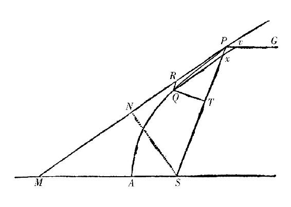 保留引理的作图,且设P是在抛物线的周线上的物体,并由它移动到下一处的位置Q,引QR平行于且QT垂直于SP,又Qv平行于切线,交直径PG于v,又交距离SP于x。现在,由于相似三角形Pxv,SPM,一个[三角形]的边SM,SP相等,另一个的边Px或QR和Pv相等。但由《圆锥截线》,纵标线Qv的平方等于通径和直径的截段Pv之下的矩形,亦即(由引理XIII)矩形4PS×Pv,或4PS×QR;又当点P和Q重合时,Qv比Qx之比(由引理VII系理2)将成为等量之比。所以在这一情形Qxquad.等于4PS×QR。但(由相似三角形QxT,SPN)Qxq比QTq如同PSq比SNq,这就是(由引理XIV系理1)如同PS比SA,亦即,如同4PS×QR比4SA×QR,且由此(由《几何原本》第V卷命题IX)QTq和4SA×QR相等。对这些等量乘以(SPq)/(QR),则(SPq×QTq)/(QR)等于SPq×4SA:所以(由命题VI系理1和系理5)向心力与SPq×4SA成反比,亦即,由于4SA给定,按照距离SP的二次反比。此即所求