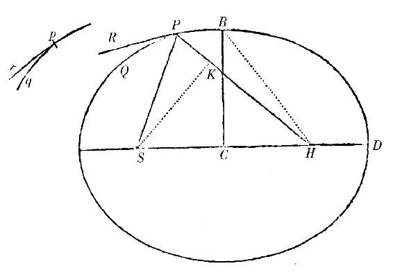 设趋向点S的向心力使物体p在任意给定的轨道pq上运行,并设这个[物体]在位置p的速度已知。设物体P从位置P沿[直]线PR以给定速度离去,此刻之后,向心力使它从那条线折入圆锥截线PQ,所以直线PR与这条圆锥截线切于P。另一条直线pr同样与轨道pq切于p,且如果想象着由S落到这些切线上垂线,则(由命题XVI系理1)圆锥截线的主通径比轨道的主通径按照来自垂线的二次比和速度的二次比的复合比,由此亦被给定。设圆锥截线的通径为L。圆锥截线的一个焦点S亦被给定。角RPS对两个直角的补是角RPH;另一个焦点H所在的直线PH的位置给定。向PH落下垂线SK,设想竖立共轭半轴BC,又SPq-2KPH+PHq=SHq=4CHq=4BHq-4BCq= :quad-L× =SPq+2SPH+PHq-L× 。两边加上2KPH-SPq-PHq+L× ,则L× =2SPH+2KPH或SP+PH比PH如同2SP+2KP比L。所以PH的长度及位置给定。如果物体在P的速度使通径L小于2SP+2KP,PH与直线PS位于切线PR的同侧,因此图形为椭圆,再由给定的焦点S,H,主轴SP+PH被给定。但如果物体的速度如此之大,使得通径L等于2SP+2KP,PH的长度为无穷;且所以图形为具有轴SH平行于直线PK的抛物线,因而被给定。如果物体从位置P前进的速度更大,长度PH需取在切线的另一侧;因此切线在焦点之间穿过,图形为具有主轴等于直线SP和PH之差的双曲线,因而被给定。因为在这些情形如果物体在如此求得的圆锥截线上运行,在命题XI,XII和XIII中已经证明,向心力与物体到力的中心S的距离的平方成反比;且因此[曲]线PQ正确地显示了物体从给定的位置P,以给定的速度沿位置给定的直线PR出发,由于这种力所画的曲线。此即所作