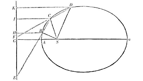 在给定三个点的情形可如此便捷地求解。设B,C,D为给定的点。连结BC,CD,并延长至E,F,使得EB比EC如同SB比SC,且FC比FD如同SC比SD。在画出的EF及其延长上落下成直角的直线SG,BH,又在无限延长的GS上取GA比AS和Ga比aS如同HB比BS;则A为轨道的顶点,且Aa为其主轴:轨道,依照GA大于、等于、或者小于AS,而为椭圆,抛物线或者双曲线;点a在第一种情形与点A落在线GF的同一侧;在第二种情形它远离以至无穷;在第三种情形它落在线GF的另一侧。因为如果向GF上落下垂线CI,DK;则IC比HB如同EC比EB,这就是,如同SC比SB;又由更比,IC比SC如同HB比SB或者如同GA比SA。且由类似的论证可证KD比SD是按照相同的比。所以点B,C,D在关于焦点S如此画出的圆锥截线上,使得由焦点S到截线上每个点所引的直线比由相同的点落到直线GF上的垂线按照那个给定的比。