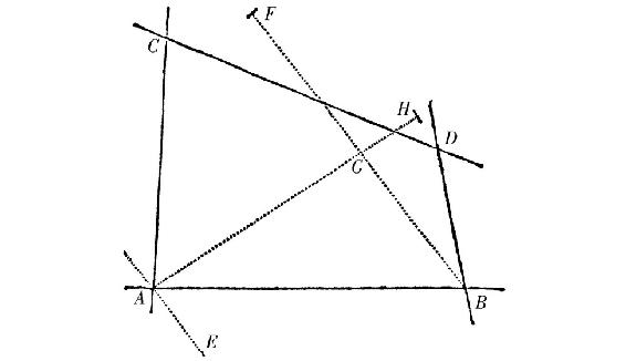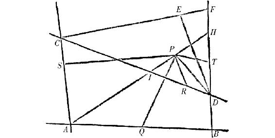 设直线AB,CD,往它们所引的两直线PQ,PR包含矩形中的一个,与其他位置给定的两条直线交于A,B,C,D。从它们之中的A作任意直线AH,你期望在其上找到点P。它截相对的直线BD,CD,即截BD于H且截CD于I,又因图形的所有角被给定,PQ比PA和PA比PS之比被给定,因此PQ比PS之比亦被给定。从给定的比PQ×PR比PS×PT中移去这个比,PR比PT之比被给定,又添加上给定的比PI比PR和PT比PH,PI比PH之比被给定,因此点P亦被给定。此即所求