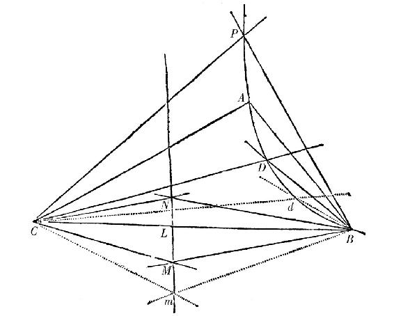 在给定的点中连结任意的三点A,B,C;且围绕它们中作为极的两点B,C,转动大小给定的角ABC,ACB,先应用股BC,CA于点D,然后用于点P,并标记点M,N,另两股BL,CL在每一情形在那里交叉。引无穷直线MN,并围绕它们的极B,C转动那些动角,使得股BL,CL或者BM,CM的交叉,它现在是m,总落在那条无穷直线MN上;且股BA,CA,或者BD,CD的交叉,它现在是d,画出所求的轨道PADdB。因为点d(由引理XXI)位于过点B,C的圆锥截线上;且当点m靠近点L,M,N时,点d(由作法)靠近点ADP。因此经过五个点A,B,C,P,D的圆锥截线被画出。此即所作
