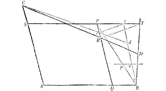 连结BP使前一作法变得更为简单,且那条直线,如果需要,则延长之,在其上取Bp比BP如同PR比PT;又过p引无穷直线pe与SPT平行,并在pe之上总取pe等于Pr;再引直线Be,Cr交于d。因为,由于Pr比Pt,PR比PT,pB比PB,pe比Pt按照相同的比;pe和Pr总相等。由这个方法发现轨道的点最为便捷,除非你愿意用机械的方法画出曲线,如按照第二种作法。