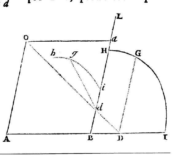 现在,我说,如果点G位于位置给定的一条直线上,点g也位于位置给定的一条直线上。如果点G位于一条圆锥截线上,点g也位于一条圆锥截线上。这里我把圆算在圆锥截线中。而且如果点G位于一条三次分析阶(ordo analyticus)的[曲]线上,则点g位于三阶的[曲]线上;同样对更高阶的曲线亦是如此。点G,g位于的两曲线的分析阶总相同。因为ad比OA如同Od比OD,dg比DG,以及AB比AD;且因此AD等于(OA×AB)/(ad),且DG等于(OA×dg)/(ad)。现在如果点G位于一直线上,因此在任意的方程中,它具有横标