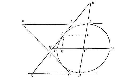 因为,如果共轭直径AB,DM交切线FG于E和H,且相互截于C,再补足平行四边形IKCL;由圆锥截线的性质,EC比CA如同CA比CL,在此情况下由分比,EC-CA比CA-CL,或者EA比AL,又由合比,EA比EA+AL或者EL,如同EC比EC+CA或者EB;且因此,由于三角形EAF,ELI,ECH,EBG相似,AF比LI如同CH比BG。同样由圆锥截线的性质,LI或者CK比CD如同CD比CH,由并比(ex æquo perturbate):AF比CD如同CD比BG。此即所证