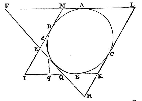 系理2 且如果引第六条切线eq交切线KI,MI于q和e;矩形KQ×ME等于矩形Kq×Me;且KQ比Me如同Kq比ME,再由分比,如同Qq比Ee。