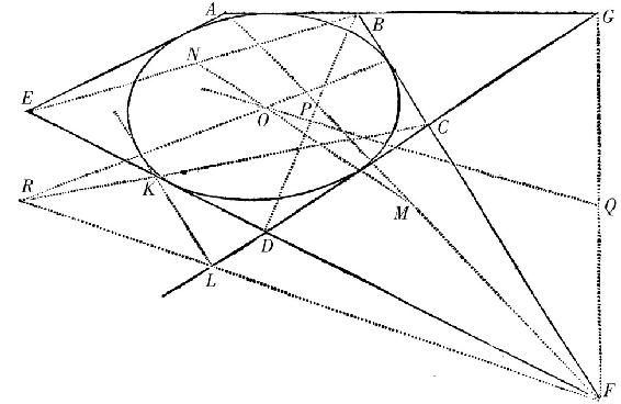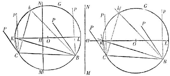 但是轴的平方的彼此之比如同KH比LH,且由此,经过给定的四个点,易于画出种类被给定的轨道。因为,如果给定的点中的两个点构成极C,B,第三点给定动角PCK,PBK[的大小];由这些给定的能画出圆BGKC。然后,由于轨道的种类给定,OH比OK,且因此OH自身被给定。以O为中心且OH为间隔画另一个圆,直线,它与这个圆相切,且当初始的股CP,BP交于给定的第四点时,经过股CK,BK的交点,是轨道能被画出的那条尺子MN。因此,种类给定的不规则四边形(如果排除某些不可能的情形)可内接于任意给定的圆锥截线。