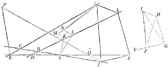 这个问题亦可如下作出。连结FG,GH,HI,FI,延长GF至V,并连结FH,IG,且使角FGH,VFH等于角CAK,DAL。AK,AL与直线BD交于K和L,由此引KM,LN,由其中的KM作角AKM等于角GHI,且它比AK如同HI比GH;又由LN作角ALN等于角FHI,且它比AL如同HI比FH。向直线AD,AK,AL的那些方向引AK,KM,AL,LN,使字母CAKMC,ALKA,DALND与字母FGHIF转回的顺序相同;再作MN交直线CE于i。使角iEP等于角IGF,又设PE比Ei如同 FG比GI;再经P引PQf,它与直线ADE所含的角PQE等于角FIG,又交直线AB于f,再连结fi。在直线CE,PE的那些方向引PE和PQ,使字母PeiP和PEQP与字母FGHIF有相同的环形顺序,且如果在直线fi上以相同的字母顺序作与不规则四边形FGHI相似的不规则四边形fghi,又外接轨道的种类给定,问题得解。
