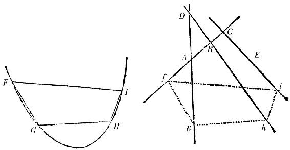 设要画的一条轨道,它与曲线FGHI相似,且它的部分与那条曲线的部分FG,GH,HI相似并成比例,位于位置给定的直线AB和AD,AD和BD,BD和CE之间,第一部分位于第一组直线之间,第二部分位于第二组之间,第三部分位于第三组之间。作直线FG,GH,HI,FI,画出(由引理XXVII)不规则四形fghi,它与不规则四边形FGHI相似,且它的角f,g,h,i与那些位置给定的直线AB,AD,BD,CE接触,每个角按所说的顺序。然后围绕这个不规则四边形画出与曲线FGHI相似的轨道。