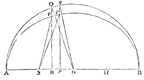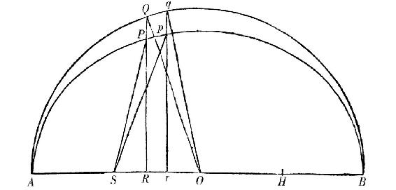因为以中心O,间隔OA画半圆AQB,且弧AQ交LP,如果需要则延长之,于Q,又连结SQ,OQ。设OQ交弧EFG于F,且向同一条OQ上落下垂线SR。面积APS如同面积AQS,亦即,如同扇形OQA和三角形OQS之间的差,或者如同矩形 OQ×AQ和 OQ×SR之间的差,这就是,由于 OQ被给定,如同弧AQ和直线SR之间的差,且因此(由于给定的比SR比弧AQ的正弦,OS比OA,OA比OG,AQ比GF是相同的,且由分比,AQ-SR比GF-弧AQ的正弦[亦是相同的])如同弧GF和弧AQ的正弦之间的差GK。此即所证