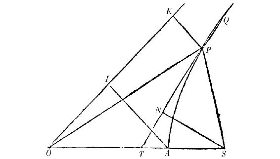 且由没有什么不同的计算,双曲线的问题被解决。设它的中心为O,顶点为A,焦点为S且渐近线为OK。设被割下的面积的量已知,它与时间成比例。设它为A,且猜测直线SP的位置,它割下的面积APS接近真实的面积。连结OP,且自A和P向渐近线[OK]引AI,PK平行于另一条渐近线,且由对数表,面积AIKP被给定,它等于面积OPA,从三角形OPS中减去它,剩下割下的面积APS。应割下的面积A和割下的面积APS的差的二倍2APS-2A或者2A-2APS除以直线SN,它自焦点S垂直于切线TP,得到弦PQ的长度。在A和P之间内接那条弦PQ,如果割下的面积APS大于应割下的面积A,否则朝向点P的相反方向:点Q为物体的更精确的位置。又由持续的重复计算,愈来愈精确的位置被发现。