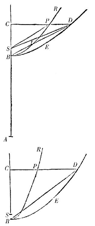 情形2 如果那个图形RPB为双曲线,对同样的主直径AB画直角双曲线(22)(hyperbola rectangula)BED;且因为面积CSP,CBfP,SPfB比面积CSD,CBED,SDEB,一个对一个,按照高度CP,CD的给定的比;又面积SPfB与时间成比例,在此期间物体P的运动经过弧PfB;面积SDEB亦与同样的时间成比例。减小双曲线RPB的通径以至无穷并保持横截径,则弧PB与直线CB,且焦点S与顶点B,以及直线SD与直线BD重合。因此,面积BDEB与时间成比例,在此期间物体C竖直下落画出直线CB。此即所求